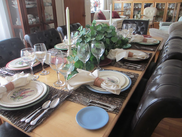 Those plates are so pretty, and I really like the use of various colors of charger plates with them. This is such a pleasant, spring-like table, it gets across that sunny feeling quite well. (Love the napkin rings!)